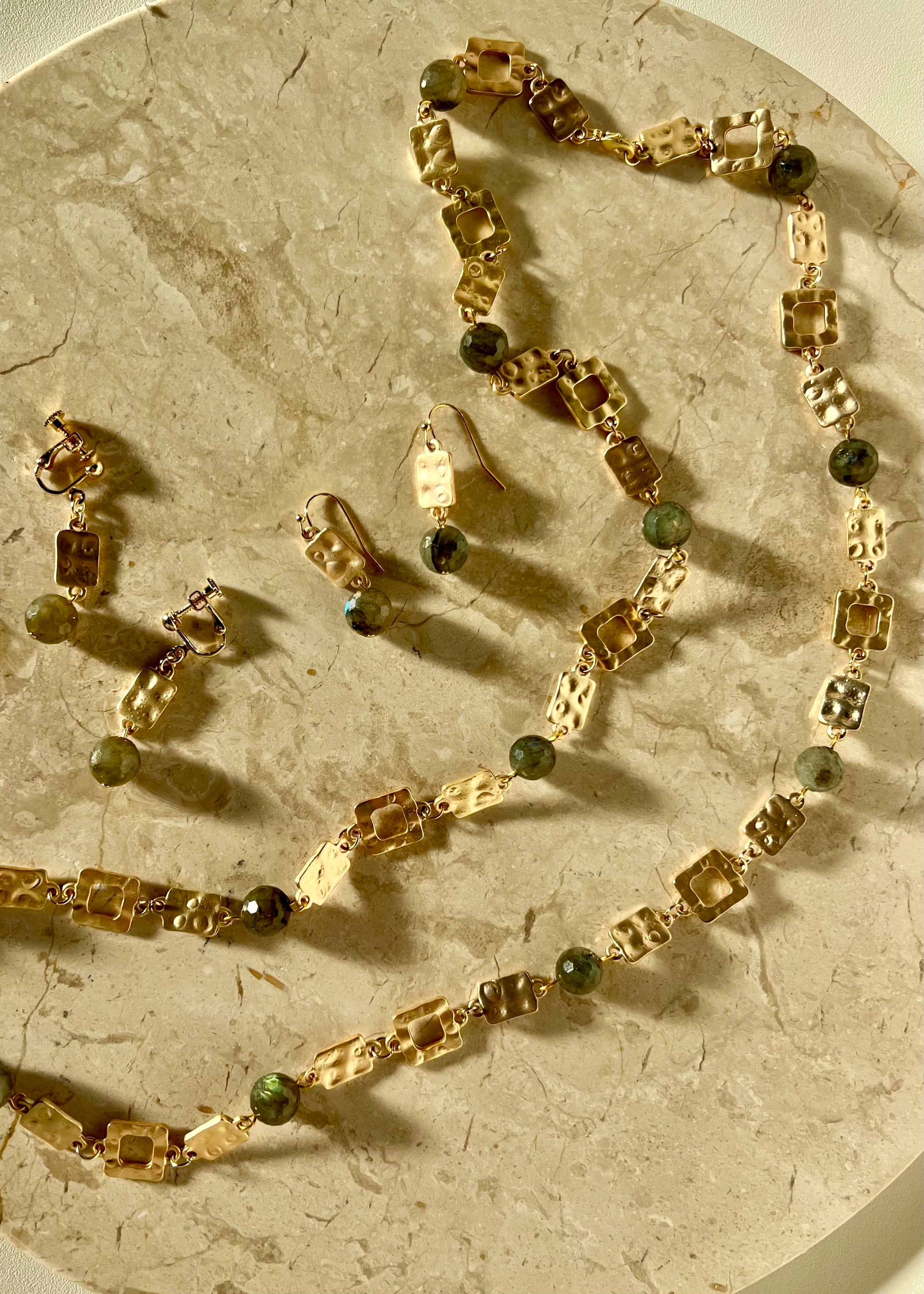 マットゴールドメタルモチーフ&ラブラドライトロングネックレス