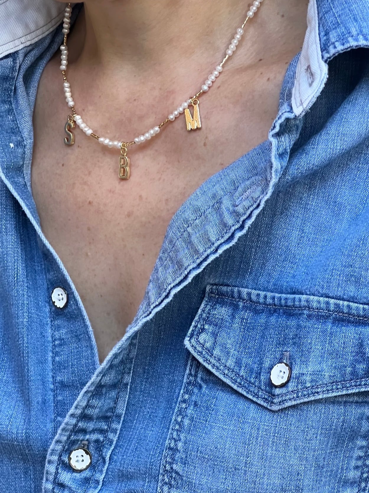 アルファベットチャームは14Kゴールドでコーティングされているため、上品にきらりと輝きます。ネックレス部分には淡水パールと14Kゴールドコーティングのメタルパーツを使用。