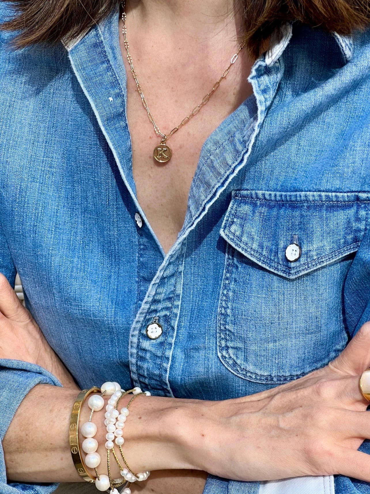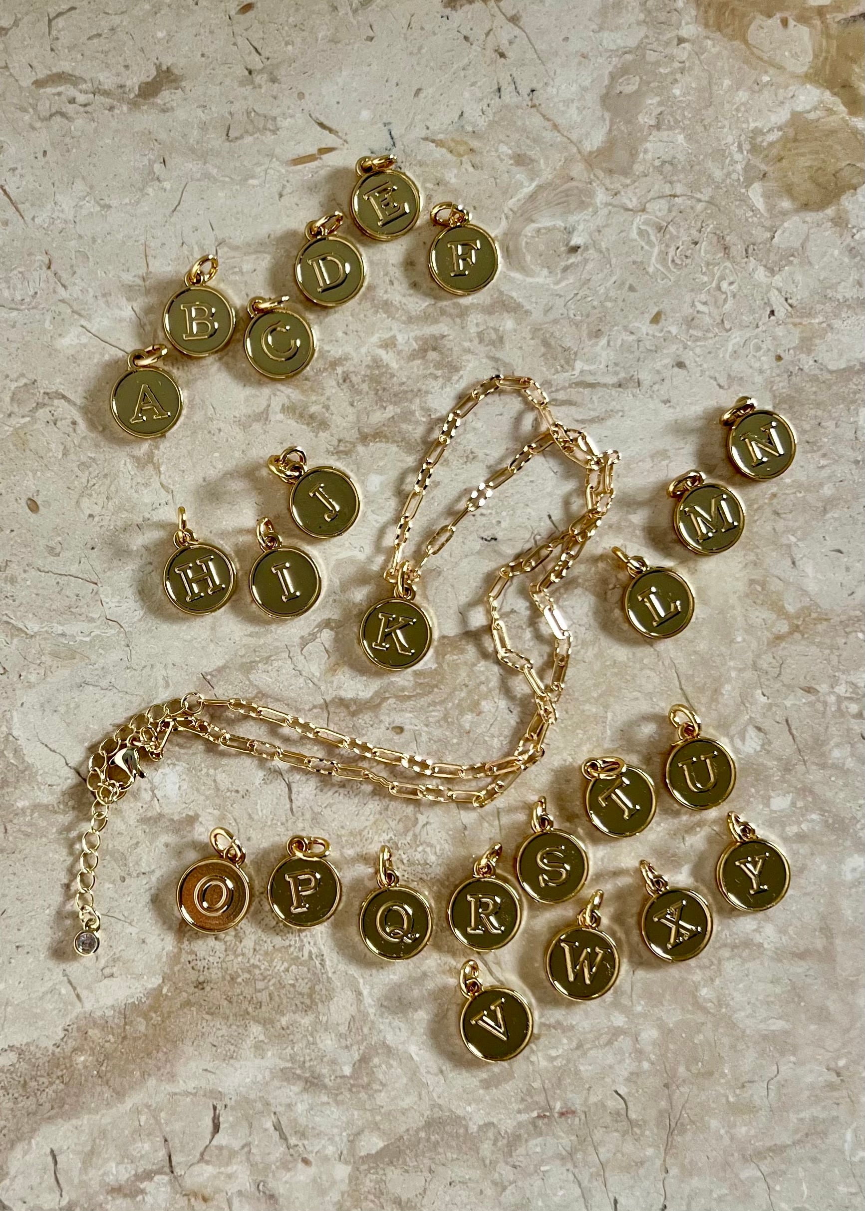 メダル、チェーンともに14Kゴールドコーティングが施されているので、上品に煌めき、お手持ちのジュエリーとの馴染みも抜群。大人のためのイニシャルネックレスです。