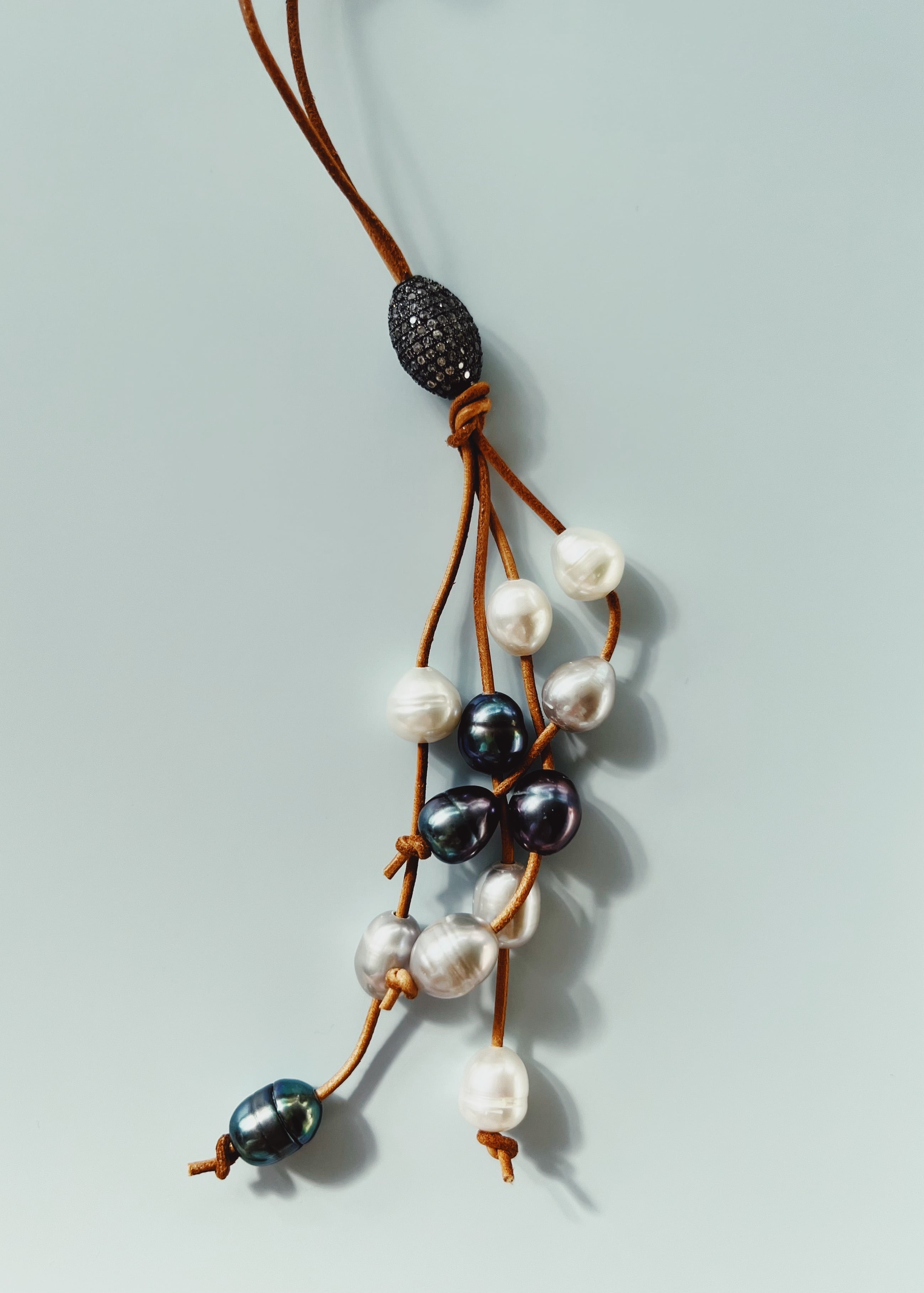【Details / 商品説明】パールにレザーを組み合わせた、カジュアルに楽しめるチャーミングなネックレスです。ブラック、グレー、ホワイトと、コントラストの効いたマルチカラーパールとクリスタルパーツがコーディネートを引き締め、縦長のデザインは身に着ける人のスタイルを細長く見せてくれます。