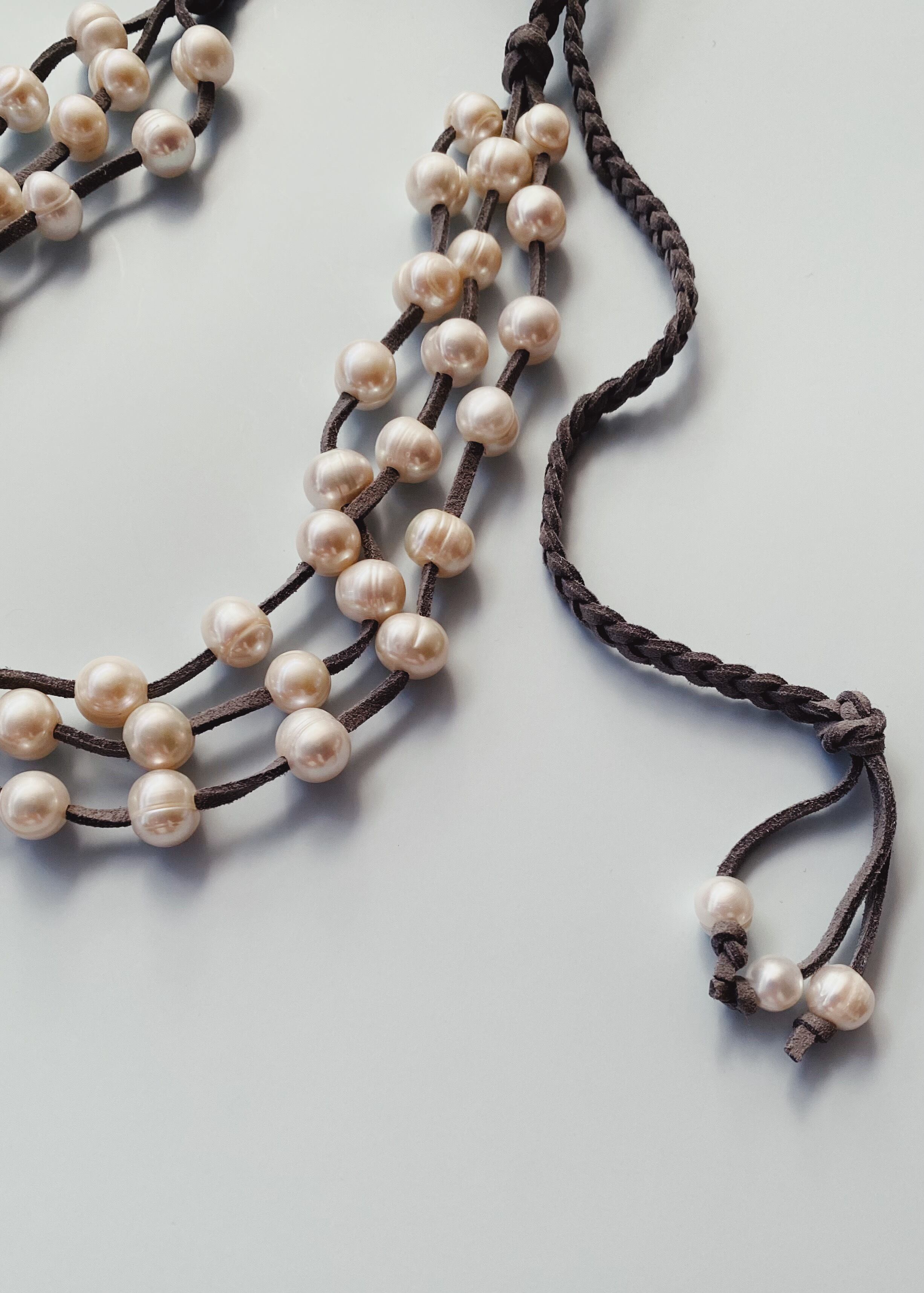 フロント3連パールレザーリボンネックレス(ライトグレー × ホワイトパール)