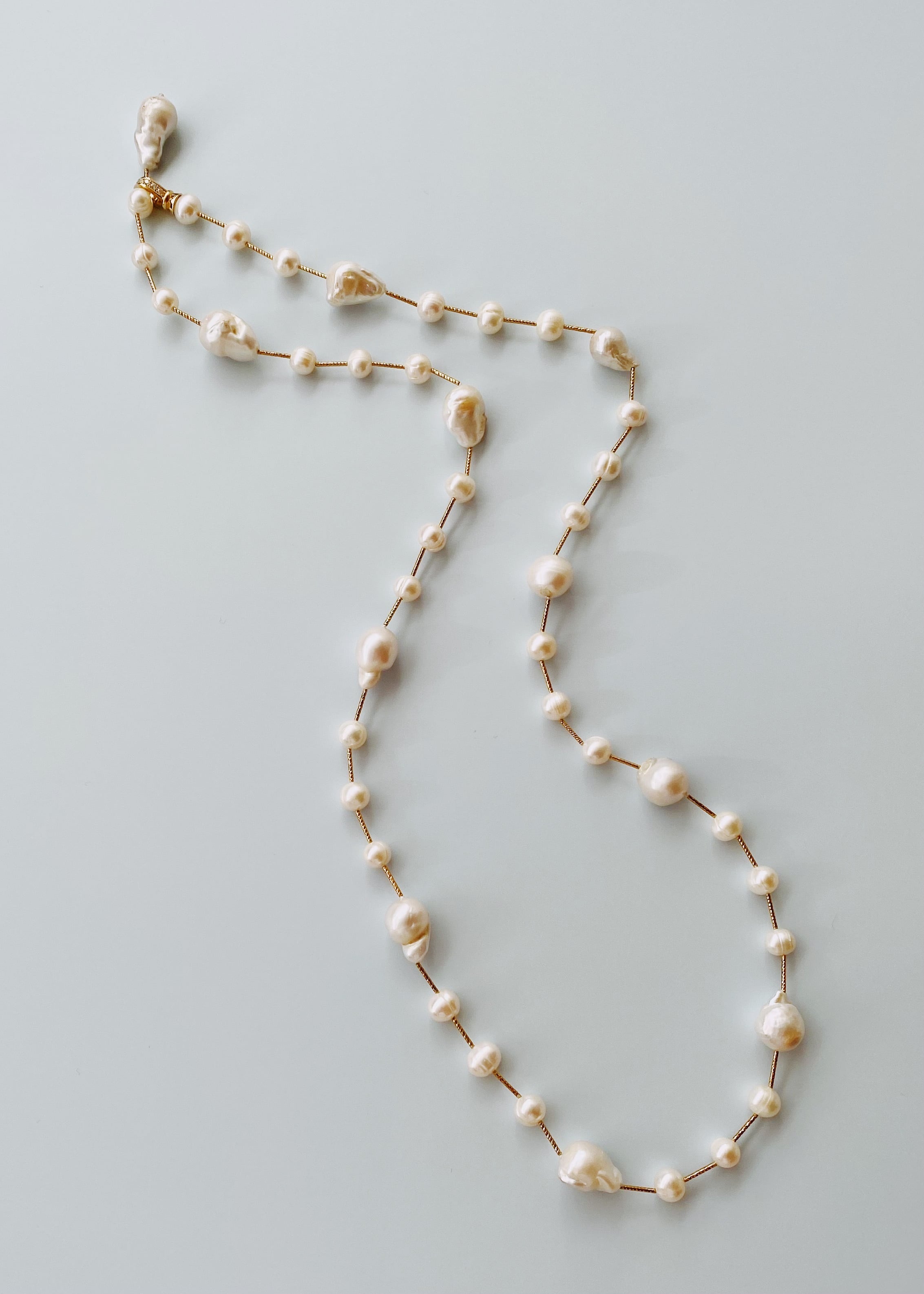 【Coordinate / おすすめコーディネート】首に2連に巻きつけ、フロントに末端の大粒バロックをペンダントヘッドにしてクラスプを留めればグラマラスでボリュームのあるショート丈のネックレスに。また、シンプルにYラインを描いてにつけるとカジュアルテイストのお洋服にも合わせやすいロングネックレスになります。ニットからTシャツ、ブラウスまで、自由に形を変えるネックレスはアイテムを選びません。