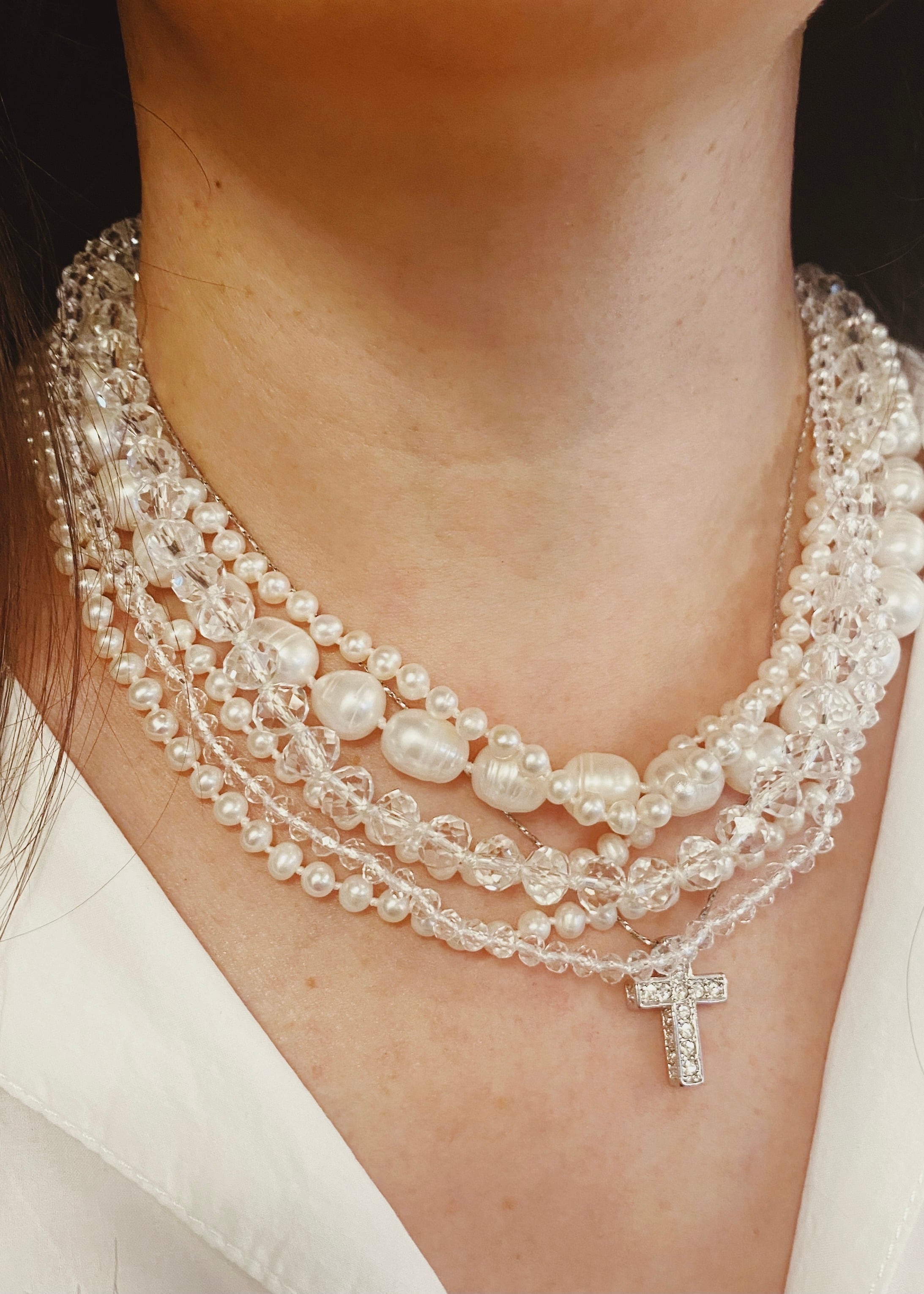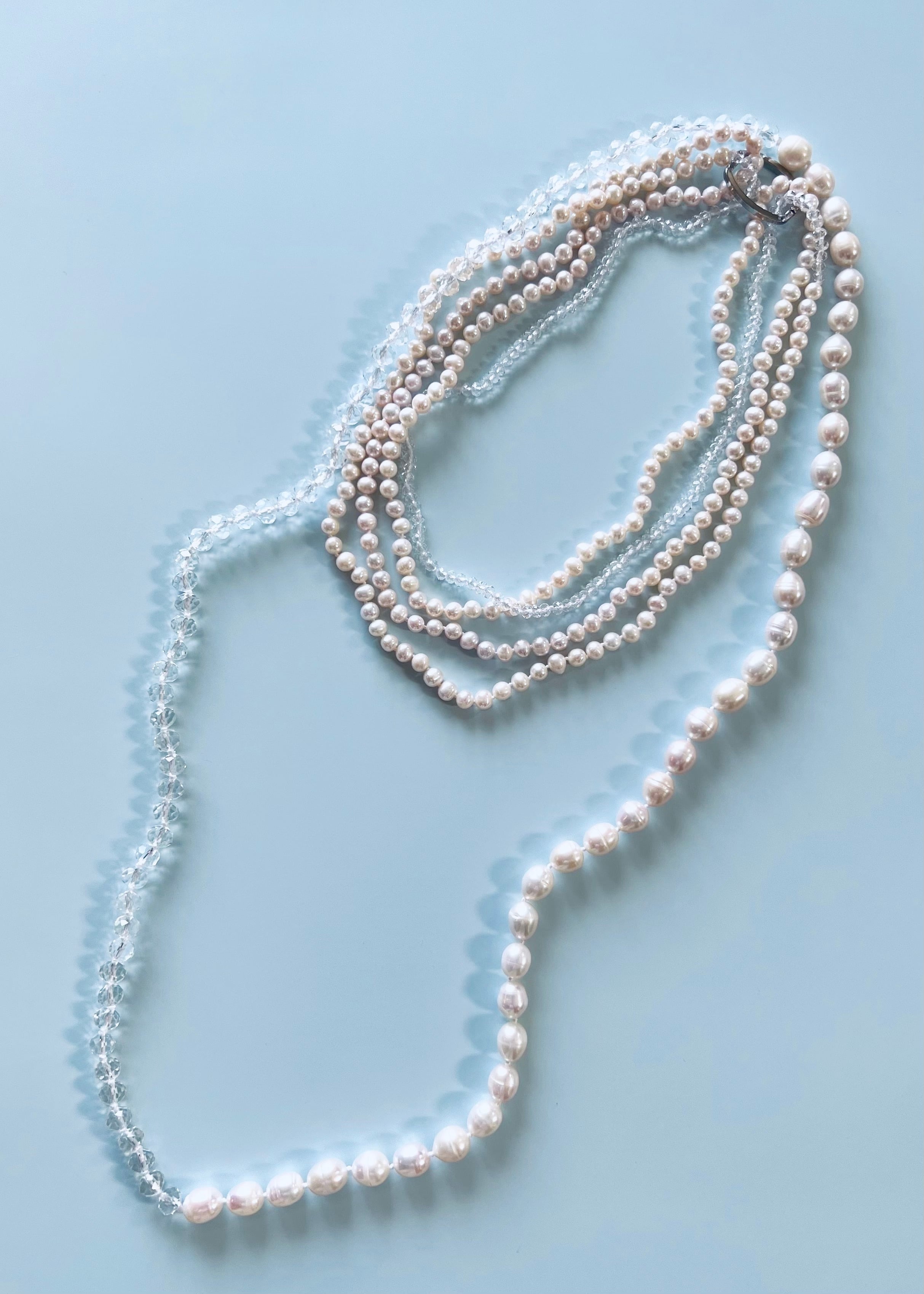 【Details / 商品説明】大粒から小粒のバロックパール、クリスタルビーズを連ねたネックレスの三本セット。それぞれデザインが違うネックレスは、一本ずつロングネックレスとして使ったり、それぞれを二つ折りにして付属の留金リングでとめれば2連(〜6連)のショートネックレスに。本数を変えたり、ネジってボリュームのあるショートネックレスにしたり... また、留金リングを使わずに後ろや前で結ぶ事でも自由に長さが変えられます。お気に入りのシャツにはショート丈で、ザックリとしたローゲージニットにはルーズに結んでミディアム丈でなど、20通りものアレンジが可能です。留金リングパーツのみ金属を使用していますが、リングパーツ以外は金属不使用のネックレスです。