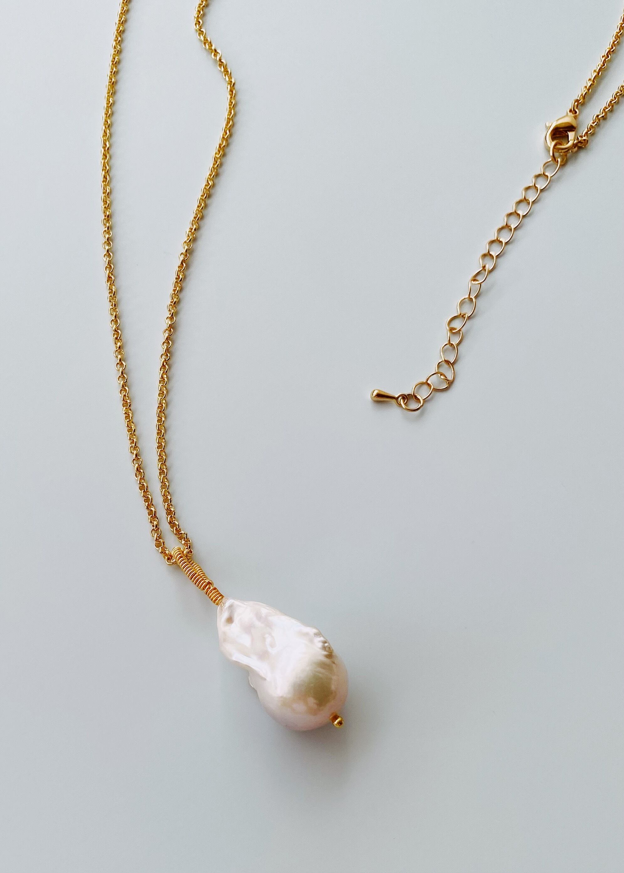 【Details / 商品説明】一粒、一粒違うシェイプ、色味、輝きの大粒バロックパールをペンダントトップにしたロングネックレス。再注目されているバロックパールをシンプルにあしらったデザインは合わせるものを選ばず、これ1本を身につけるだけで装いがアップデートされます。また、ショート丈やミディアム丈のネックレスとの重ねづけにもちょうど良い長さ。バロックパールは様々なスタイルのアクセントとなり、印象に残るコーディネートが完成します。