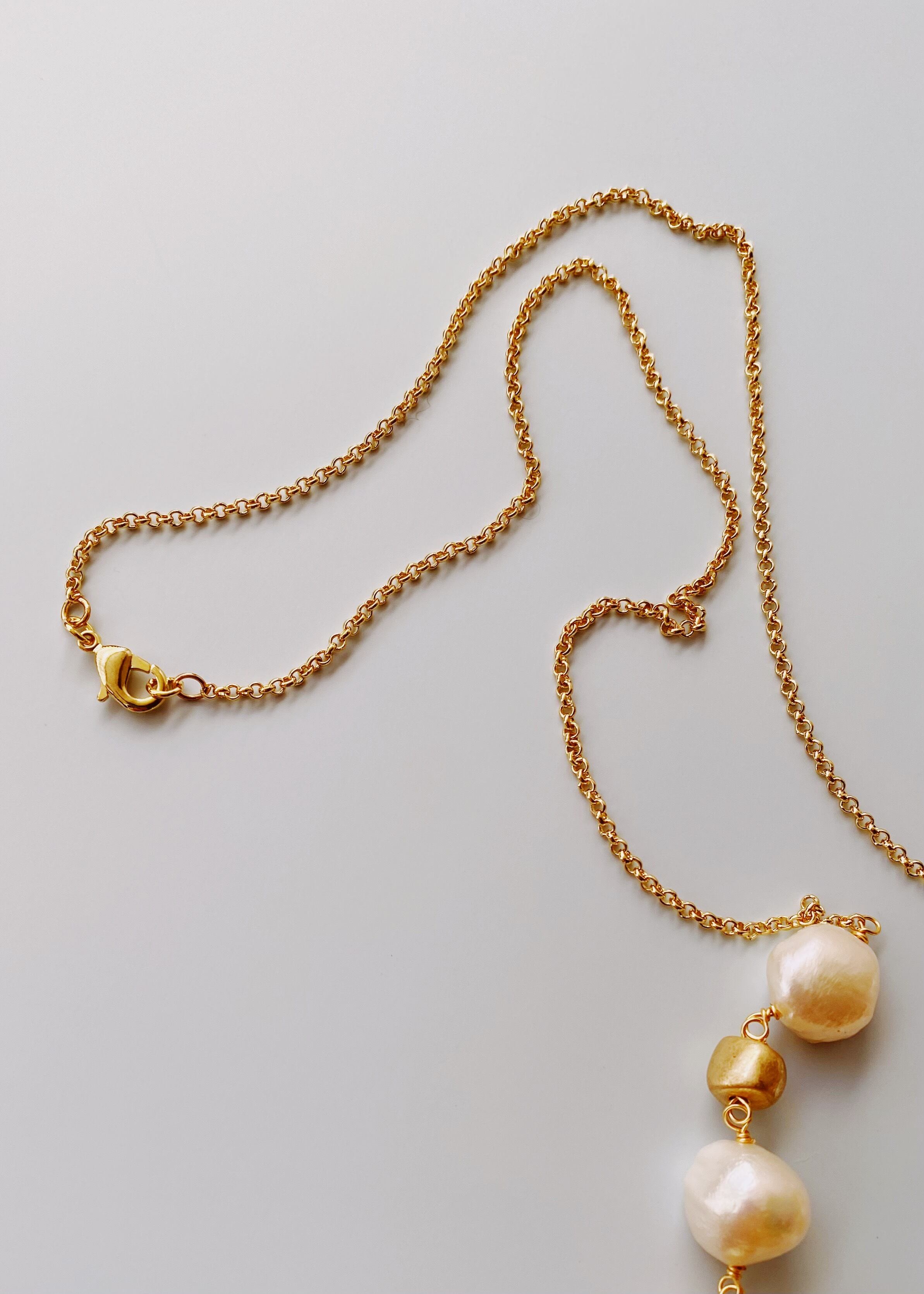 【Details / 商品説明】大粒のバロックパールで描かれたY字の先端に大きな雫型のチャームが揺れるロングネックレス。身に着ける人をスラリと細長く見せるこのデザイン、カットソー、ニット、そしてシャツとの相性も良く、おしゃれ上級者の「こなれ感」まで着こなしに加えてくれるネックレスです。翡翠の目が覚めるような美しい緑色はコーディネートのポイントになり、高貴な印象を与えてくれます。