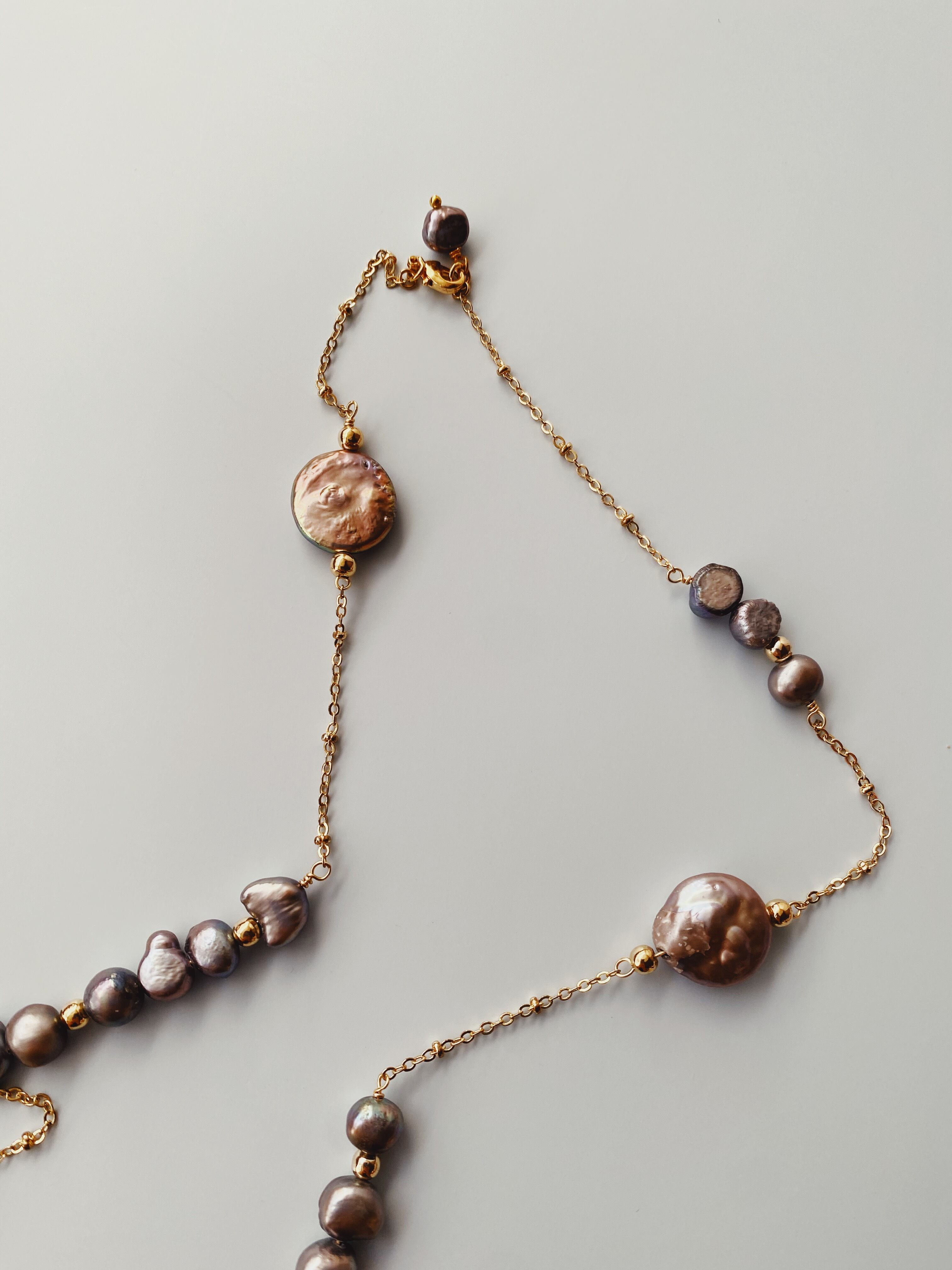 【Details / 商品説明】バロック大粒タイプ、スモールコイン型、スティック状に連ねた小粒タイプなど、様々なシェイプのパールにラブラドライトを加えた、贅沢なステーションロングネックレス。パールと14Kゴールドプレートチェーンの組み合わせは普段使いし易く、遊び心を発揮してコーディネートを考えたくなります。とにかくチャーミングな魅力を漂わせてくれるアイテムです。