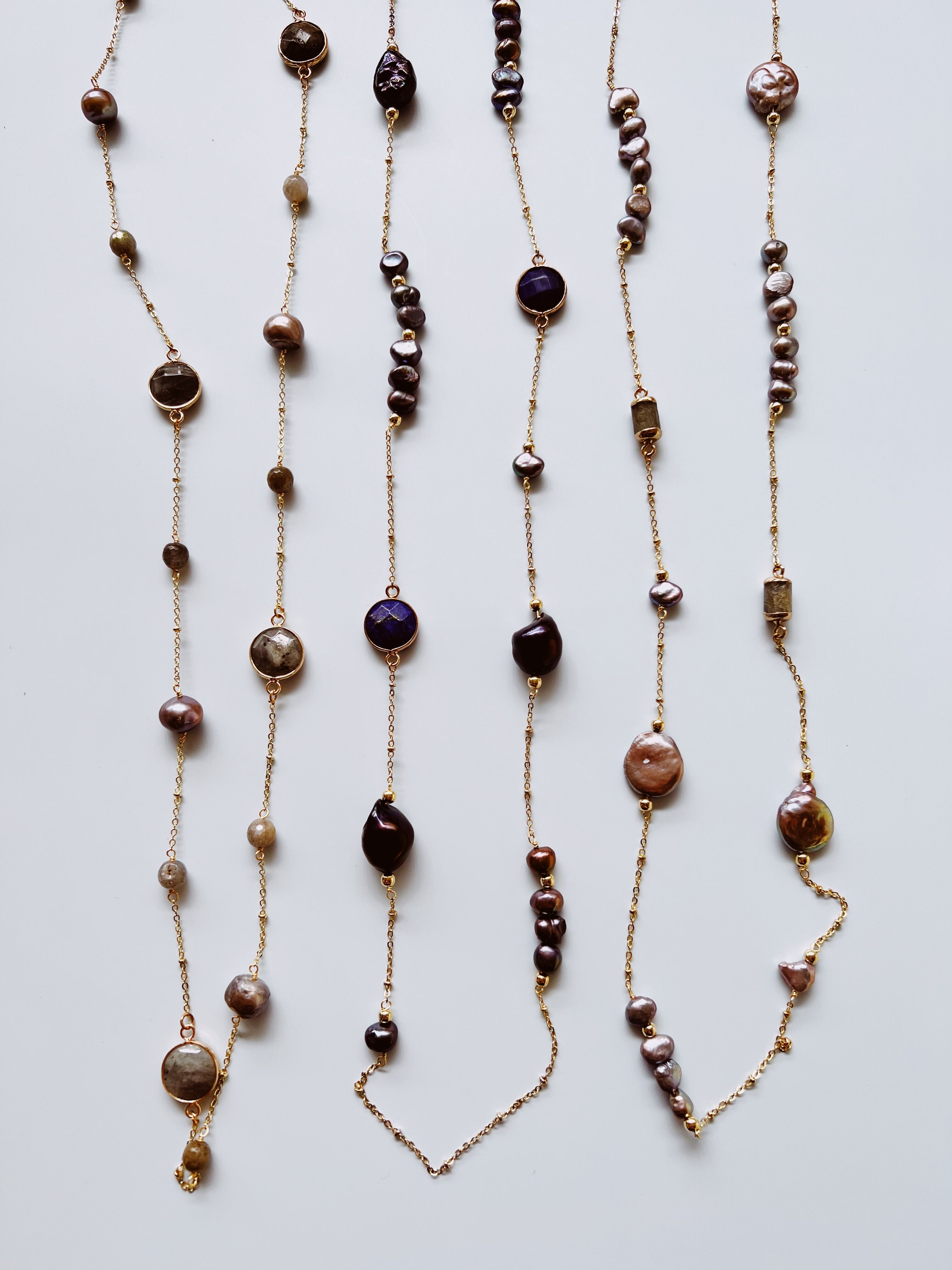 留金は好きな位置に移動できます。長さを調整したり、2連のショートネックレスにしてみたり、フロントでYの字(Yライン)になるように留めるなど、デザインチェンジを簡単に楽しめます。どんなお洋服にも馴染むので普段使いし易く、遊び心を発揮してコーディネートを考えたくなるデザインです。