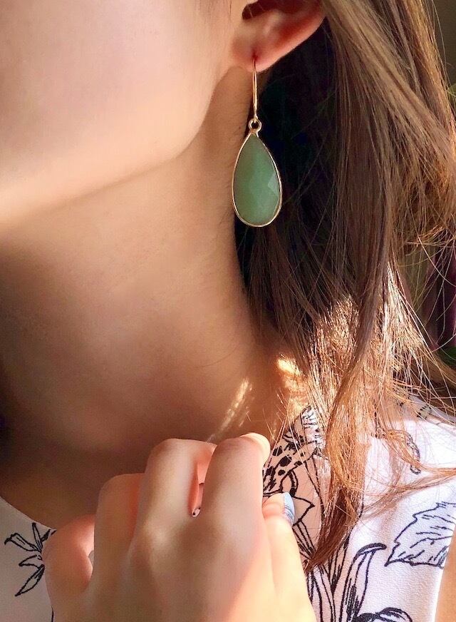 使用されているティアドロップ型のグリーンジェイドは大きめのサイズですが、天然石ならではのな質感が決して悪目立ちさせることなく、太陽の光を浴びてフレッシュに輝き、コーディネートを新鮮にまとめてくれます。合わせやすいこのデザインとお色味、飽きのこないピアスです。