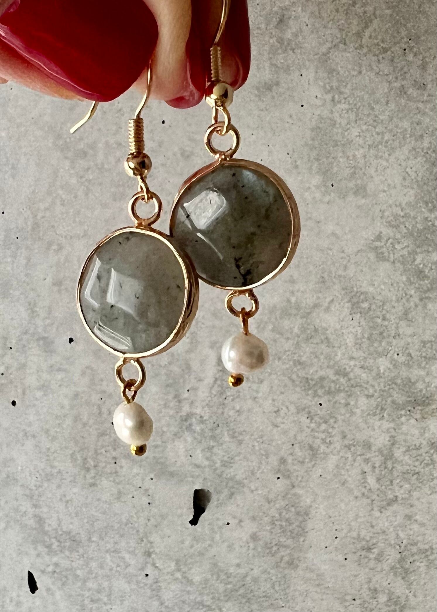 【Details / 商品説明】ラブラドライトの温かみのあるグレー色は合わせるお洋服を選びません。揺れる一粒パールが愛らしく、全体の印象に上品さを加えてくれます。