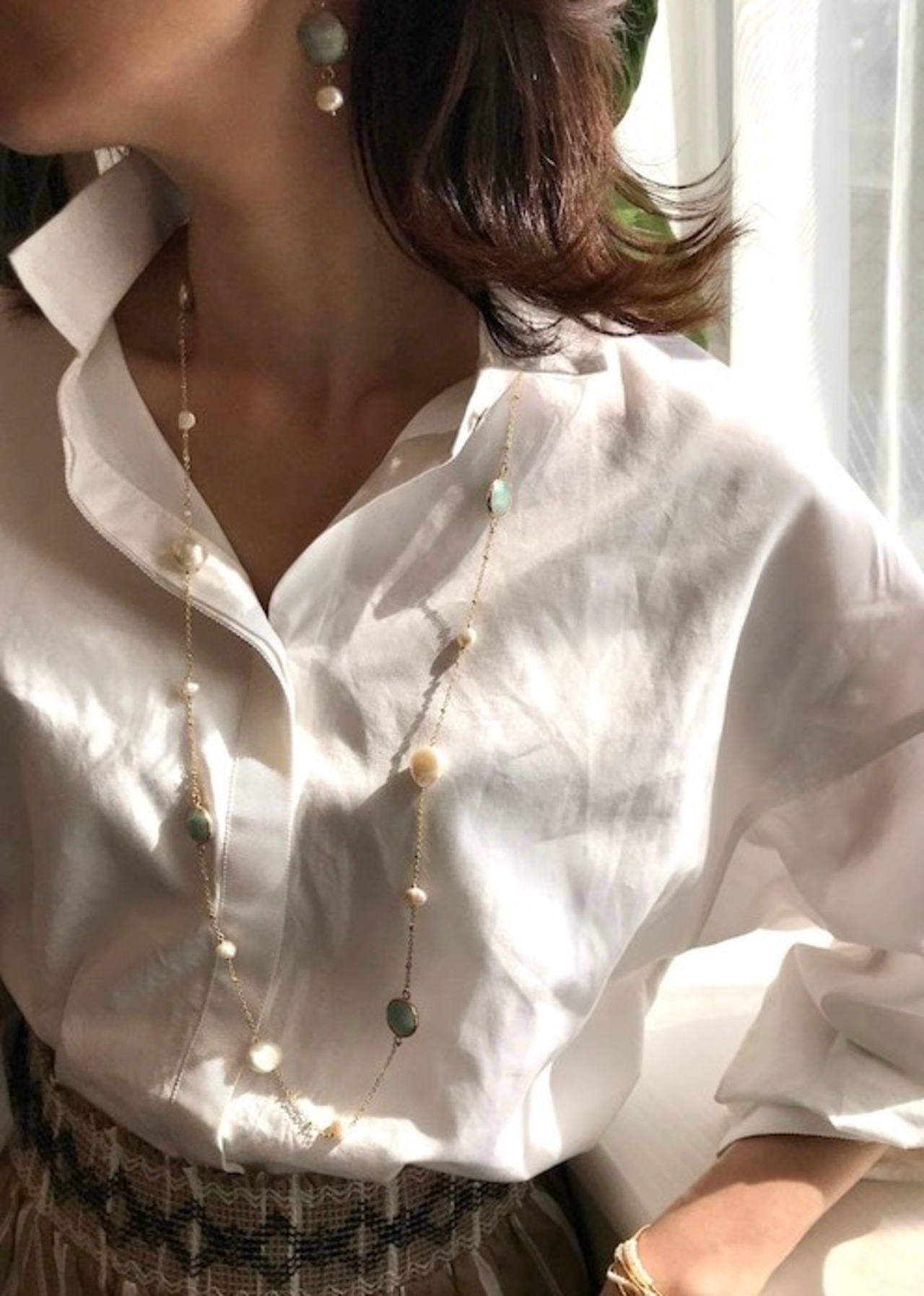 【Details / 商品説明】バロック大粒パール、コイン型アマゾナイト、スティック状に連ねたパールをリズム良く贅沢に組み合わせたステーションロングネックレス。このデザインはどんなお洋服にも馴染むので普段使いし易く、遊び心を発揮してコーディネートを考えたくなります。