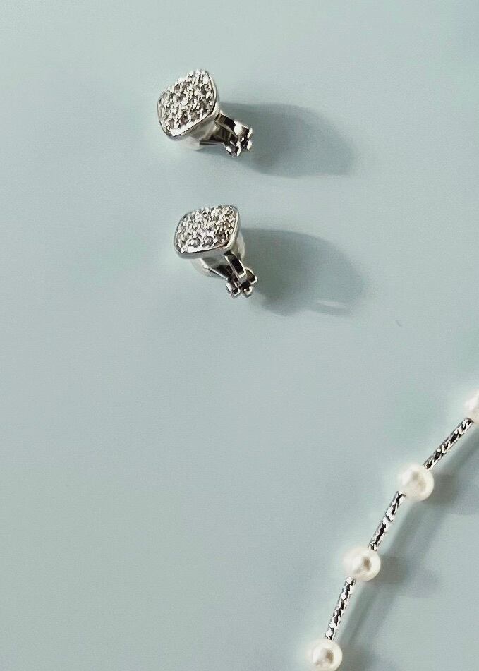 【Details / 商品説明】スワロフスキークリスタルを敷き詰めたスクエア型のスタッズイヤリング。耳元からキラキラと光を放ち、お顔を両サイドから明るく輝かせます。ベースに18Kホワイトゴールドプレートが使用されているので大人っぽさも十分にあり、クールで洗練された印象に。合わせるお洋服のテイストを選びません。
