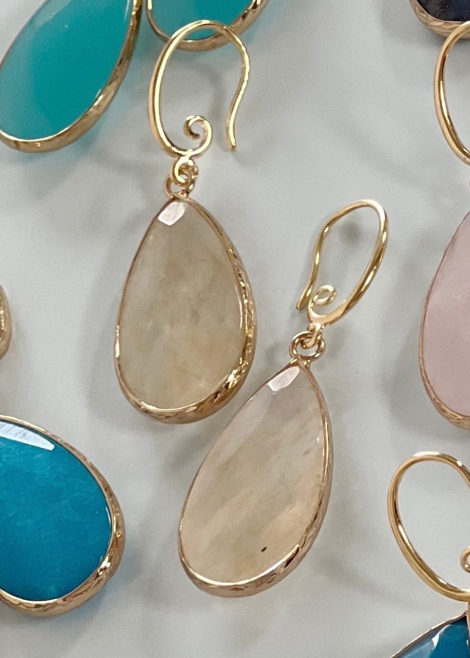 キラキラとした金色の煌めきが閉じ込められたクォーツは華やかさそのもの。コーディネートに取り入れ易い色味で、季節を問わず飽きのこないピアスです。