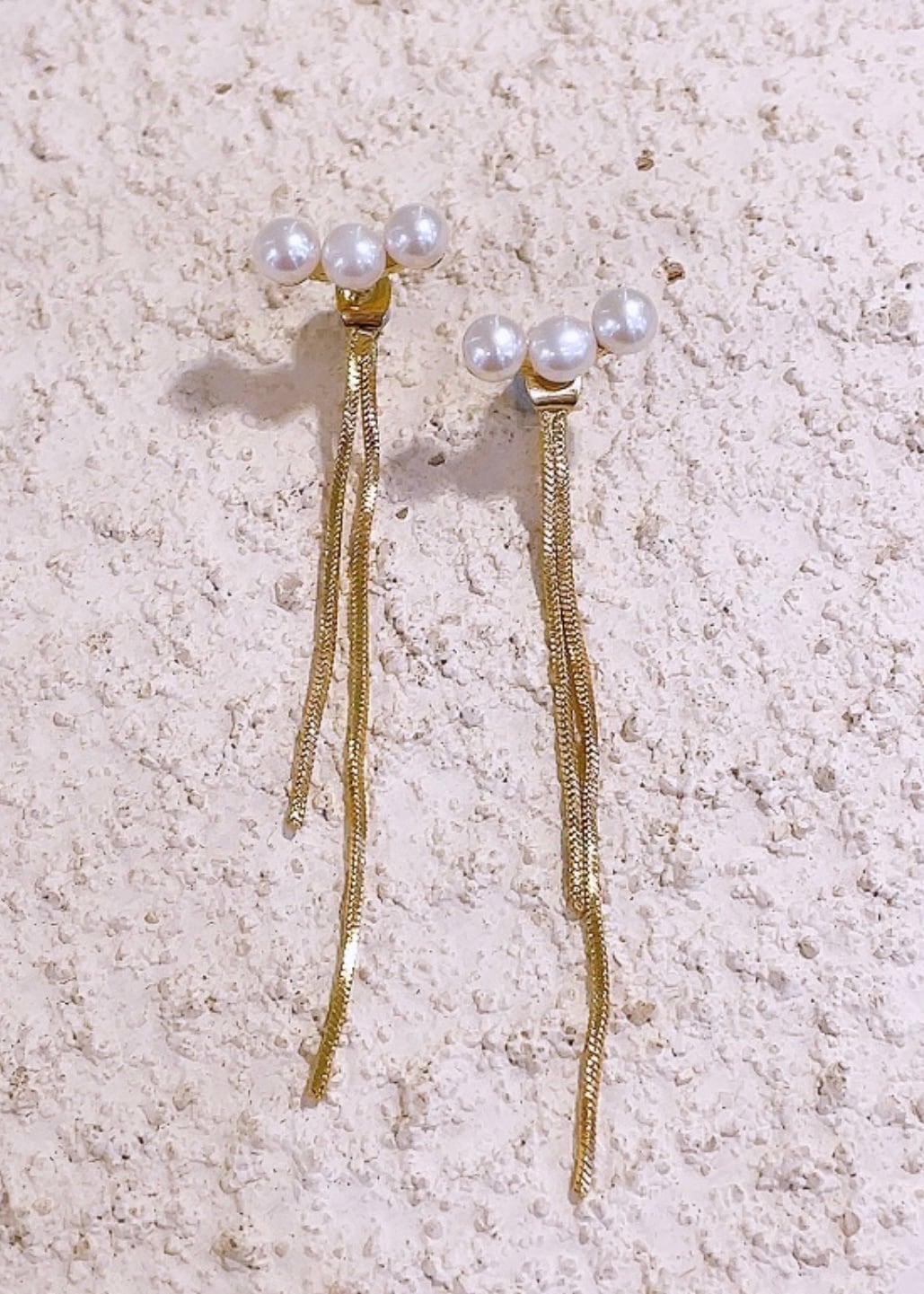 【Details / 商品説明】小粒のパールがスマイルラインを描くかのように3つ並び、耳の後ろ側には華奢な14Kゴールドコーティングチェーンが揺れるデザインで、チェーン部分は取り外し可能な2WAY。14Kゴールドコーティングならではのチェーンは輝き方に品があり、コーディネートをさらりと格上げいたします。