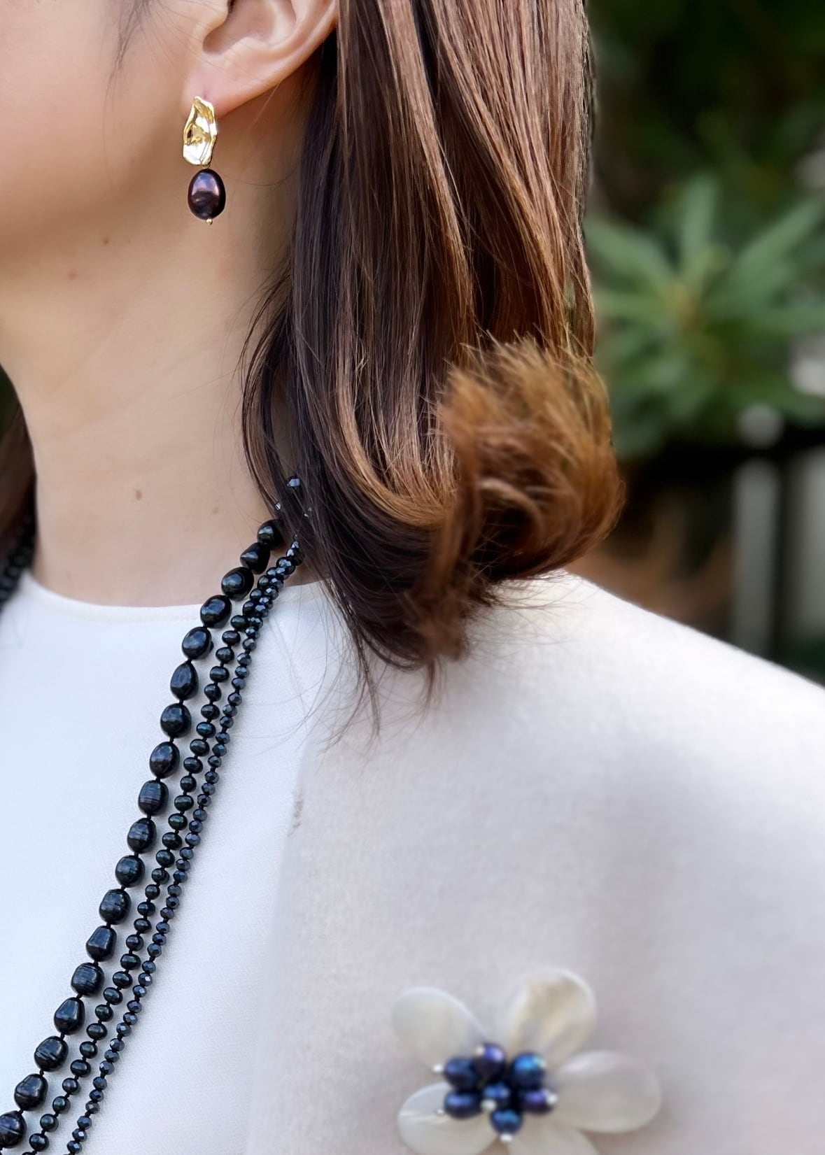 【Details / 商品説明】深いネイビーブルーのバロックパールが揺れる知的な印象のピアス。この独特なお色がコーディネートを引き締めるアクセントとなります。ひと味違うモードなスタイルを楽しみたい時、グラマラスな変化が欲しい時にぴったりです。ゴールドカラー、シルバーカラーの2色展開。