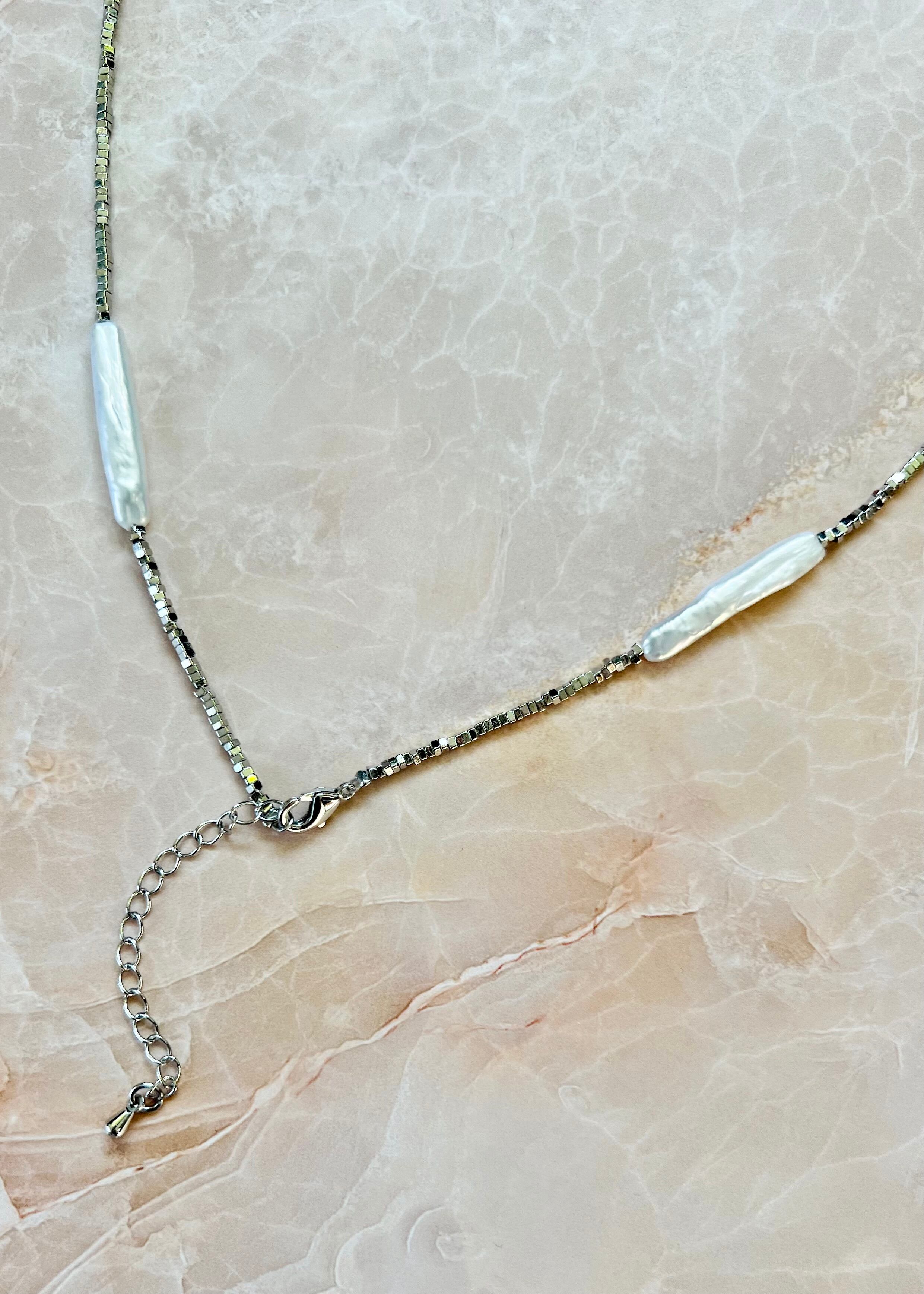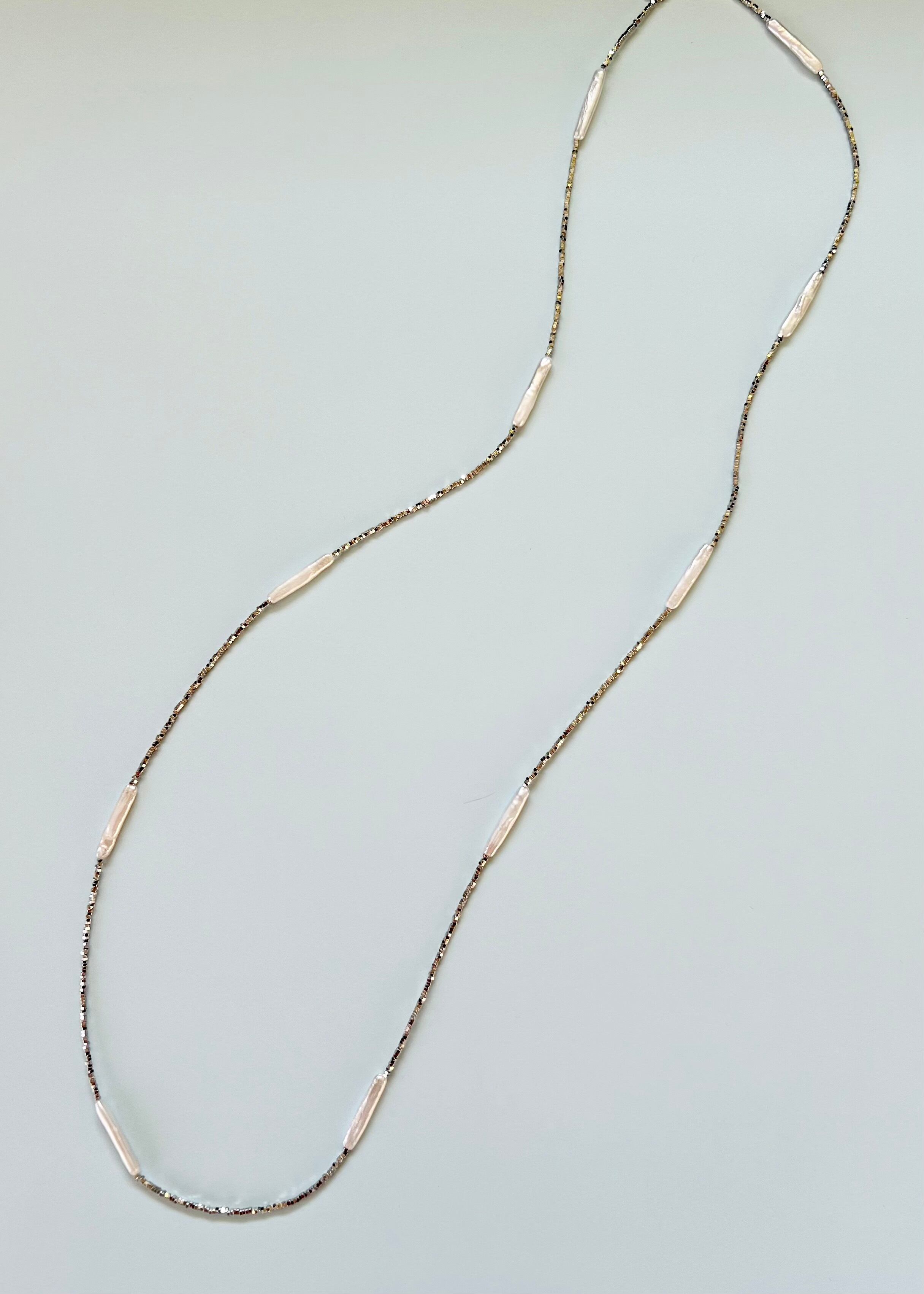 【Details / 商品説明】クールなメタルビーズとスティック型の輝くパールが贅沢に連ねられたロングネックレス。毎日気軽に身につけられる、すっきりとしたハンサムなエスバイマーティンの新スタンダードです。