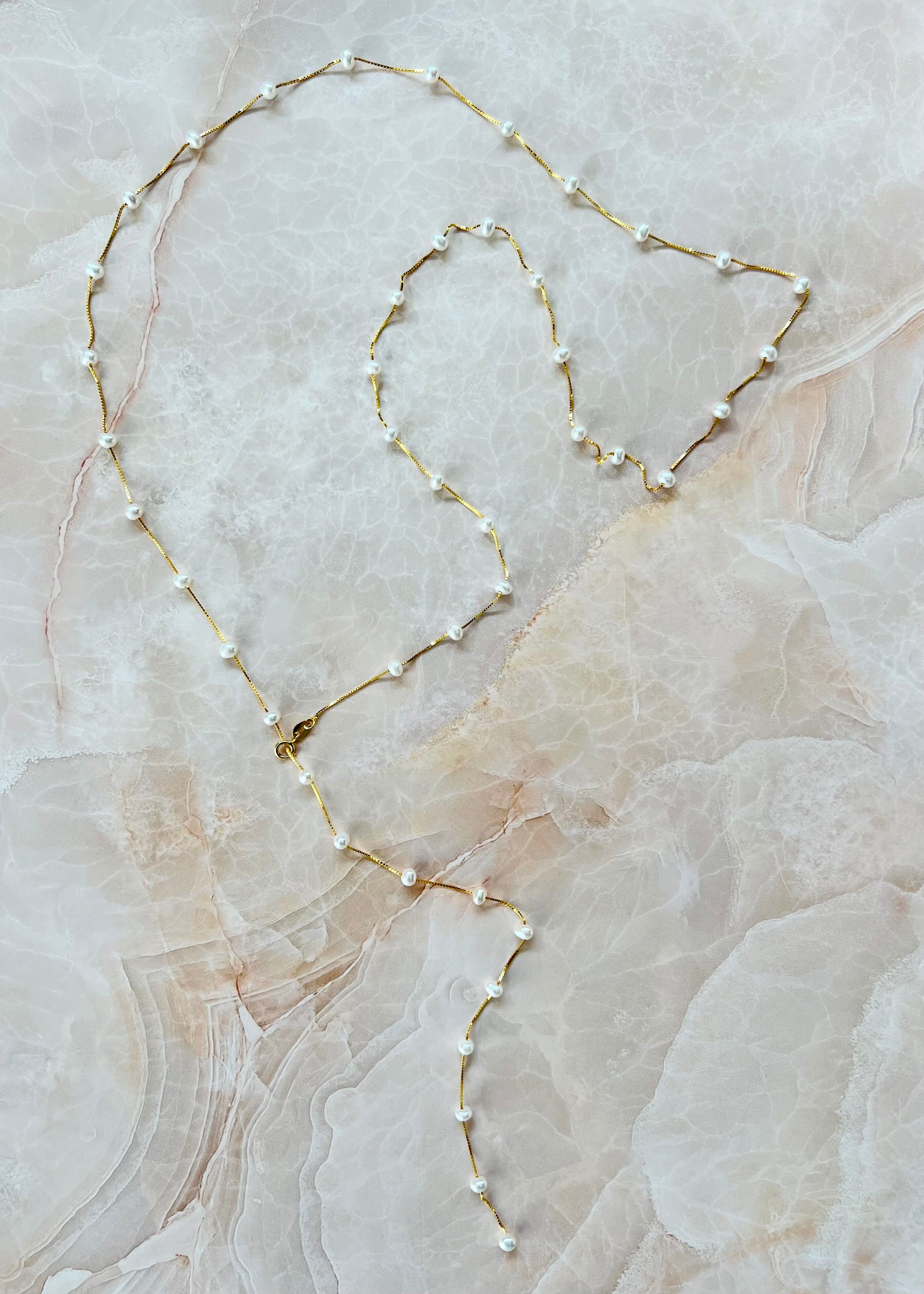 【Details / 商品説明】ベビーパールを14Kゴールドコーティングしたシルバーチェーンで等間隔に繋げた繊細なロングネックレス。こんなにも華奢なチェーンで小粒なパールなのに存在感は抜群。店頭で一目惚れするお客様が多いアイテムです。