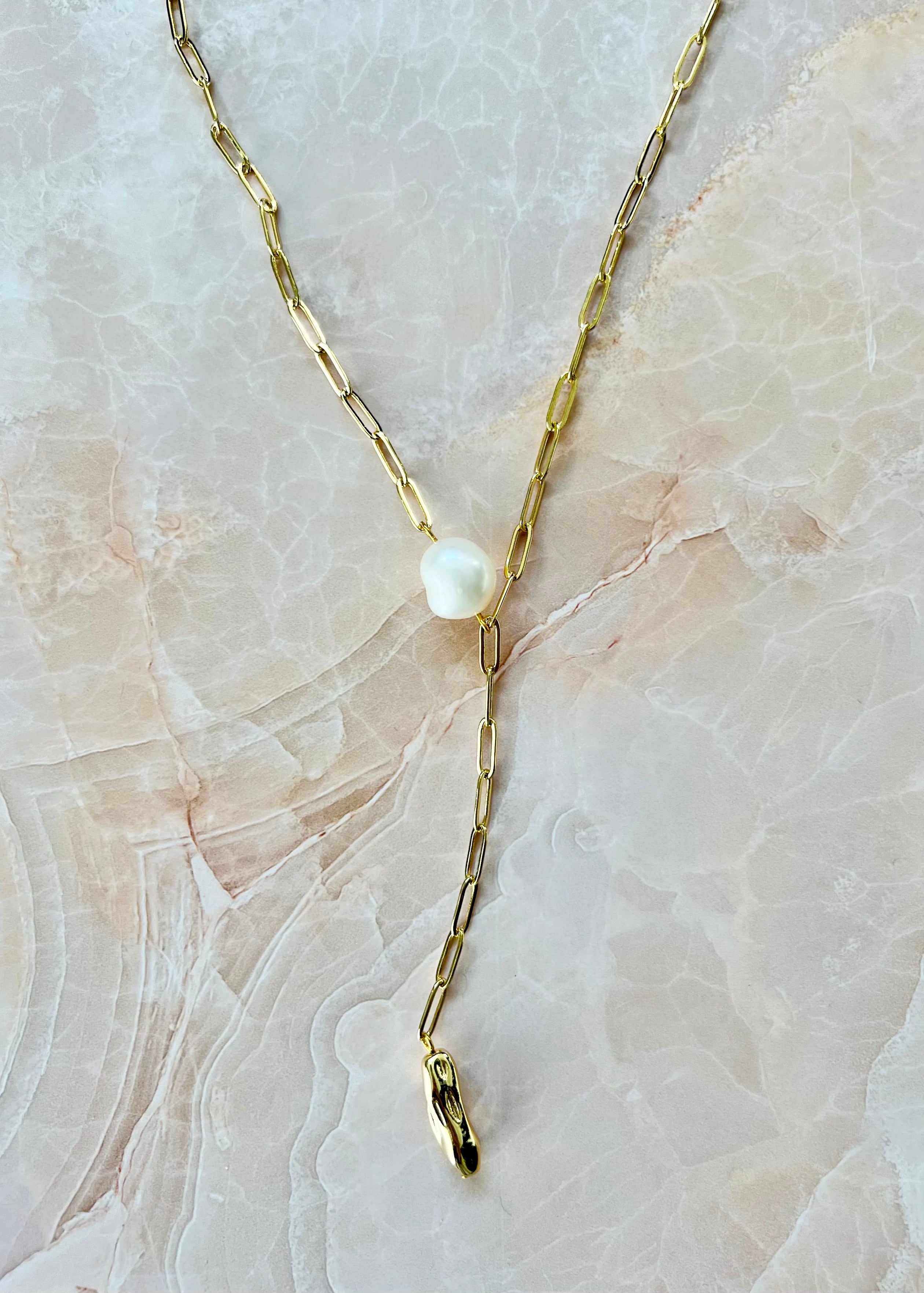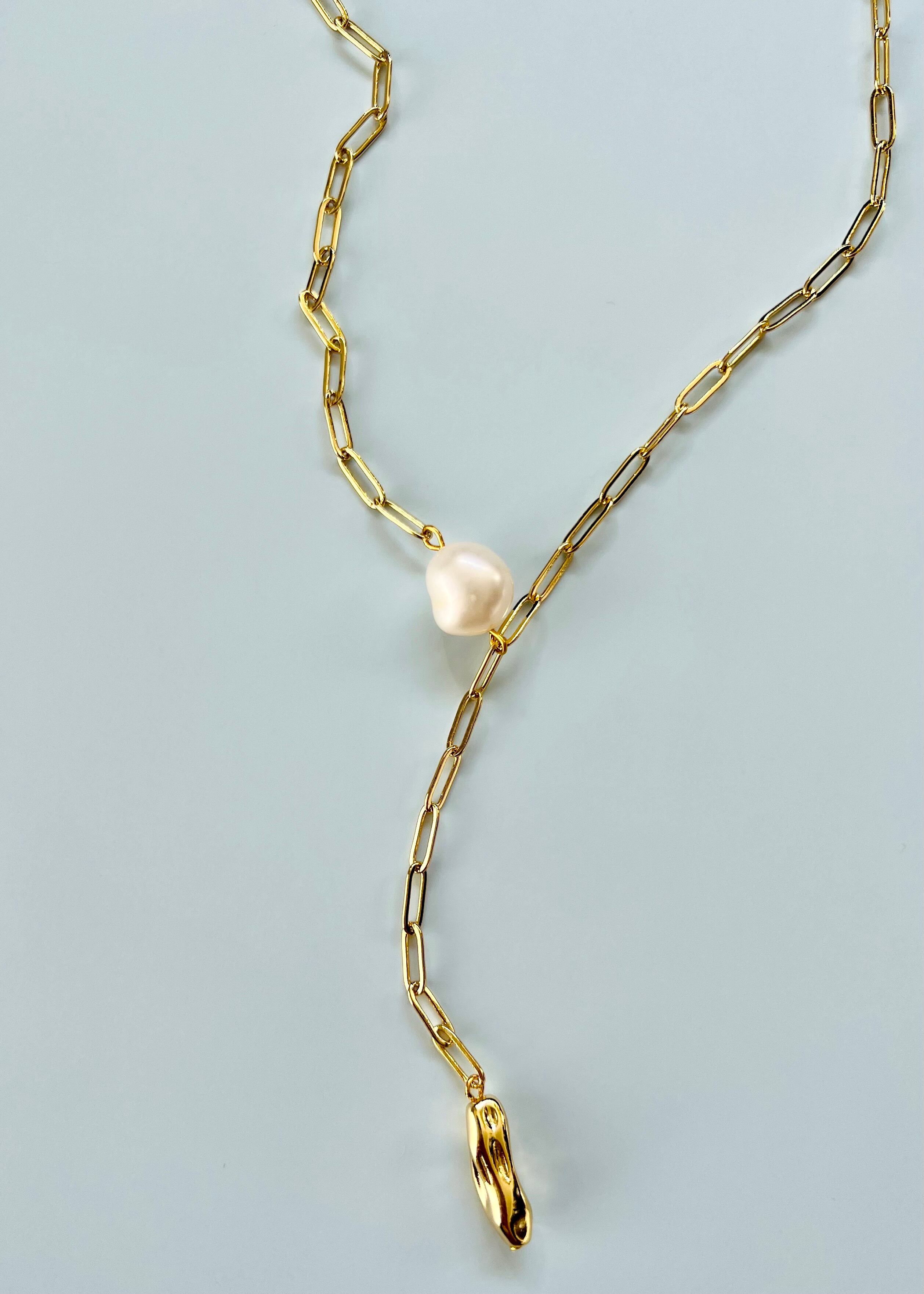 【Details / 商品説明】モードな雰囲気を持つチェーンのY字ネックレスに、アシンメトリーに配置されたひと粒のバロックパールが上品な印象を添えるネックレス。Y字のデザインはお顔から首のラインをスッキリと引き立ててくれます。